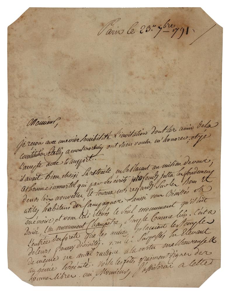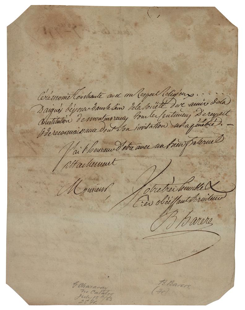 One of the most notorious members of the National Convention during the French Revolution, he presided over the trial of Louis XVI and voted for his execution (1755-1841). LS in French, signed “B. Barere,” one page both sides, 6.5 x 8.5, February 23, 1791. Untranslated letter from Paris. In very good condition, with a rusty circular paperclip impression to the top, scattered staining, and clipped corners.