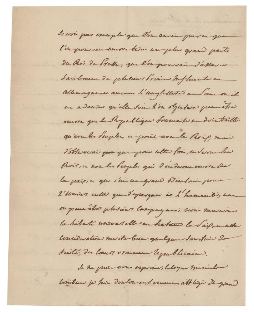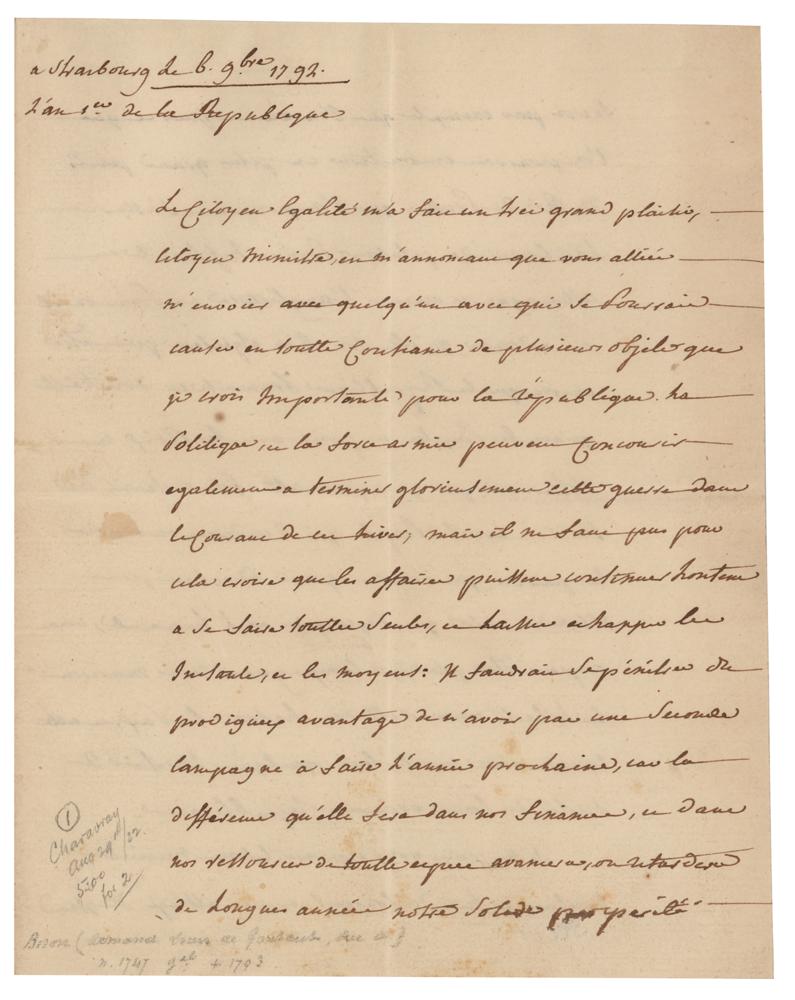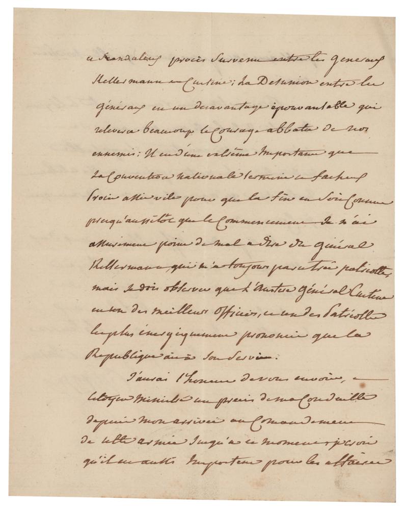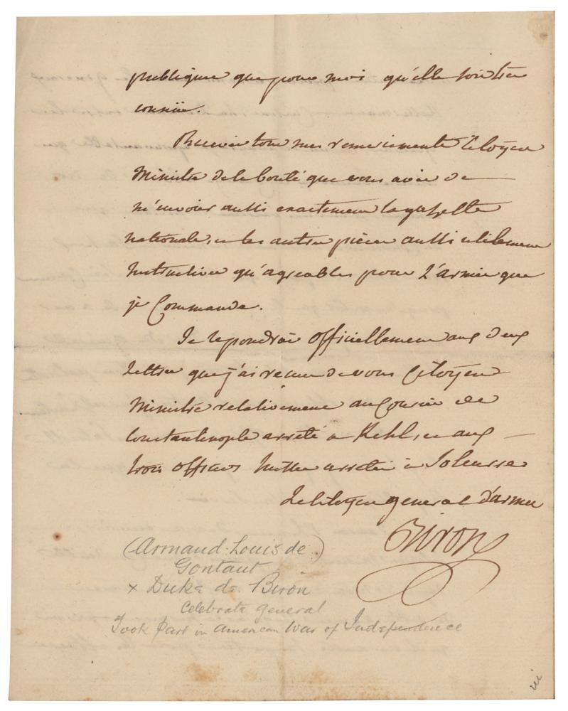 French soldier and politician, duc de Lauzun, later duc de Biron, (1747-1793) remembered for his roles in the American War of Independence and the French Revolutionary Wars. Commanding Lauzun's Legion, he successfully reinforced Washington's troops during the Siege of Yorktown in 1781. He then commanded the French Revolutionary Army on the La Rochelle front during the French Revolution, operating against the Vendéan insurgency. Accused of treason, he was guillotined during the Reign of Terror. ALS in French, signed “Biron,” four pages on two adjoining sheets, 6.25 x 7.25, November 6, 1792. Handwritten letter thanking a minister for the advice given him by Citoyen Egalite regarding the visit of a person with whom he could talk in all confidence about several important matters for the Republic. Politics and military might work together to bring the war to a glorious end next winter, but business cannot end on its own. He enumerates the means which seem to him suitable for putting an end to the war and avoiding a future campaign, such as, for example, dealing with the kings this time around: "We will ripen universal freedom by hating peace and this consideration well deserves some sacrifices of pride from truly republican hearts." Biron deplores the scandalous lawsuit between Kellermann and Custine; he will raise up the downcast courage of the enemies. In fine condition, with a few small stains.