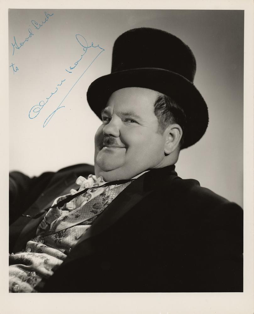 Vintage matte-finish 8 x 10 photo of the rotund comedian wearing a top hat and a mischievous smile, signed in blue ballpoint, "Good luck to, Oliver Hardy," who has left the inscription blank. In very fine condition. A crystal clear portrait of the legendary entertainer.