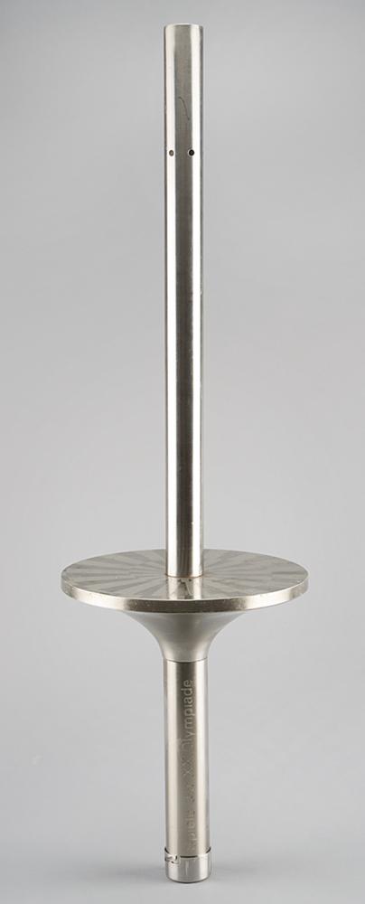 Official 1972 Munich Olympics torch, comprised of metal and steel, measuring 29″ in length and 8.5″ at its widest, designed by Friedrich Krupp AG. The torch bears Olympic rings and the inscription "Spiele der XX Olympiad, Munchen 1972" on its handle, with the name of the designer engraved on the bottom. The Munich Games emblem designs a platform at the base of the combustion tube. Platform and handle feature scattered small scuffs and marks. Traveling a shade over 5,500 km over the course of 30 days, roughly 6,000 torchbearers were used to reach and light the Olympic flame at the opening ceremony on August 26, 1972. A coveted artifact commemorating Germany's stalwart role in international sport.