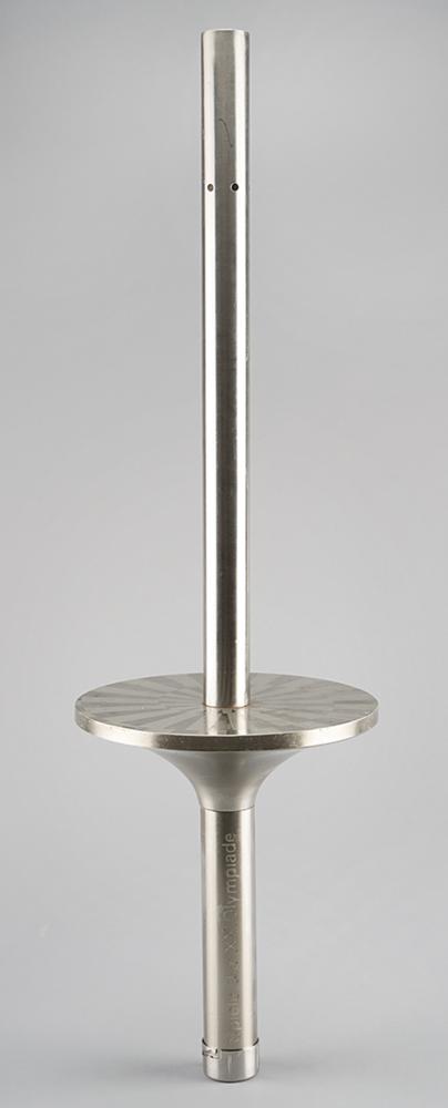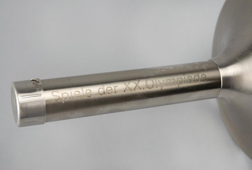 Official 1972 Munich Olympics torch, comprised of metal and steel, measuring 29″ in length and 8.5″ at its widest, designed by Friedrich Krupp AG. The torch bears Olympic rings and the inscription "Spiele der XX Olympiad, Munchen 1972" on its handle, with the name of the designer engraved on the bottom. The Munich Games emblem designs a platform at the base of the combustion tube. Platform and handle feature scattered small scuffs and marks. Traveling a shade over 5,500 km over the course of 30 days, roughly 6,000 torchbearers were used to reach and light the Olympic flame at the opening ceremony on August 26, 1972. A coveted artifact commemorating Germany's stalwart role in international sport.