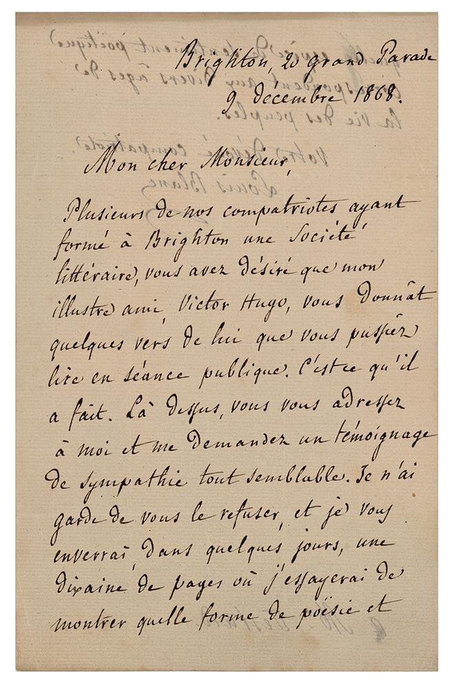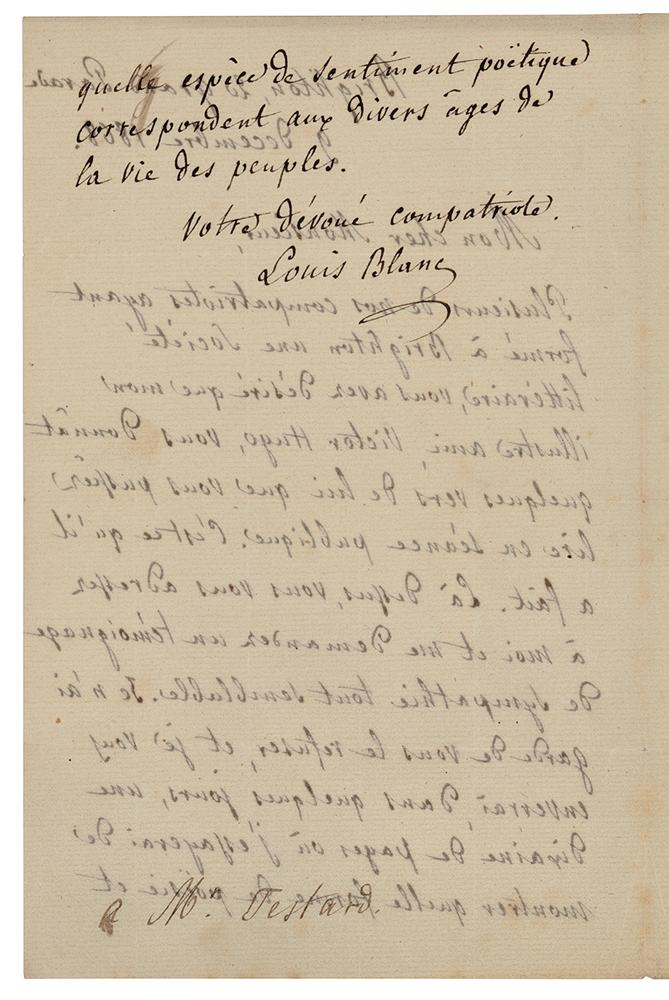 French statesman and historian (1811-1882) who was forced to abandon his post as a member of the provisional government and flee to England after the Revolution of 1848. ALS in French, one page both sides, 5.25 x 8.25, December 9, 1868. Handwritten letter to a gentleman, in part: "Several of our compatriots having formed a Literary Society in Brighton, you have wished that my illustrious friend, Victor Hugo, gave you some verses by him which you could read in public. That's what he did?You ask me for a similar token of sympathy. I take care not to refuse it to you, and I will send you, in a few days, about ten pages in which I will try to show what form of poetry and what kind of poetic feeling correspond to the various ages in the life of people." In fine condition.