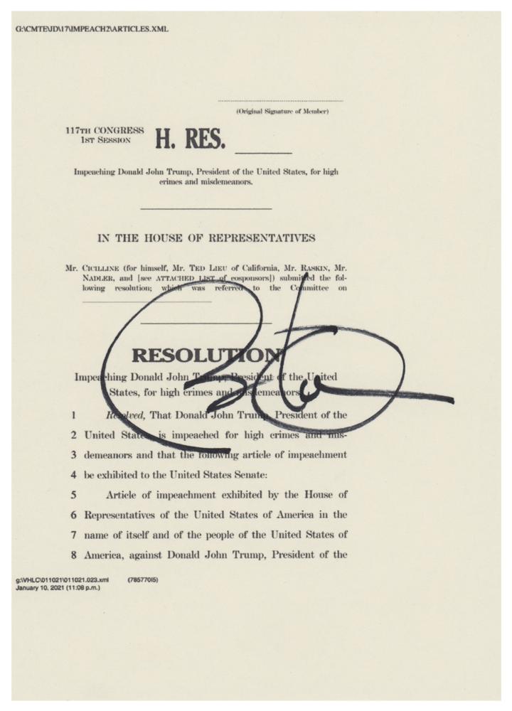 Felt tip signature, "Barack Obama," on a 5 x 7 page, on which the first page of the House Resolution impeaching President Donald Trump has been printed. In very fine condition.