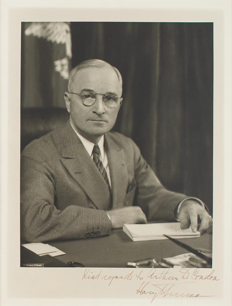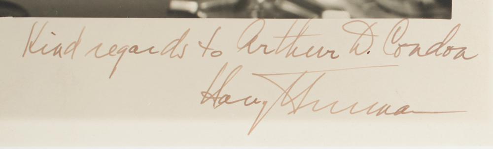 Sharp vintage matte-finish 8.75 x 11.75 portrait of Truman at his desk by Harris & Ewing, signed and inscribed in fountain pen, "Kind regards to Arthur D. Condon, Harry S. Truman.” Double-matted and framed to an overall size of 12 x 15. In very fine condition.