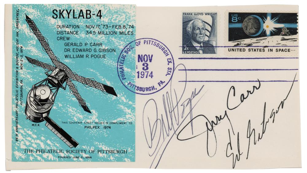 Commemorative cover with a cachet honoring the Skylab-4 mission, postmarked at the Philatelic Society of Pittsburgh two weeks prior to launch on November 3, 1974, signed in ink by Bill Pogue, Jerry Carr, and Ed Gibson. In fine condition, with trimmed edges.