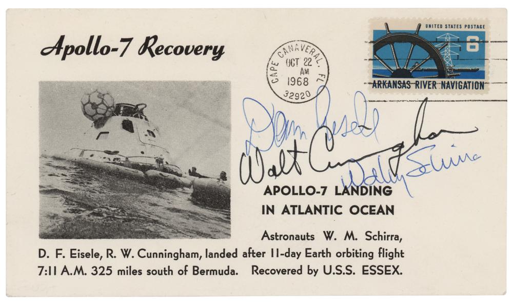 Recovery cover with a cachet honoring the Apollo 7 mission's splashdown in the Atlantic Ocean, postmarked at Cape Canaveral on the recovery date of October 22, 1968, signed in blue ballpoint by Donn Eisele and Wally Schirra, and in black felt tip by Walt Cunningham. In very fine condition.