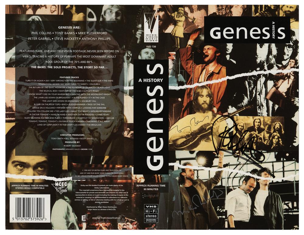 VHS cover inlay for the 1991 music documentary film Genesis: A History, measures 10 x 7.75 unfolded, signed on the right side in black felt tip by Phil Collins, in silver ink by Mike Rutherford, and in black ballpoint by Tony Banks. In very fine condition. Accompanied by a certificate of authenticity from Tracks.