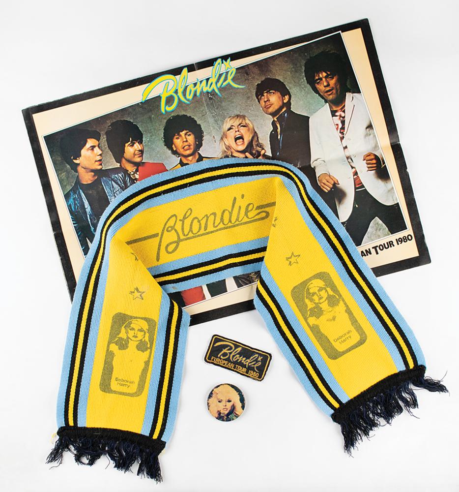 Four souvenir items from Blondie’s 1980 European Tour, including: a 4.25 x 2 embroidered patch; a 2.5″ pin of Debbie Harry; a multicolored knit scarf with fringed ends, measuring 46″ in length, featuring a central yellow bar with opposing images of Harry and middle text, “Blondie”; and a 1980 European Tour book, 12 pages, 11.75 x 16.5, which features numerous band images, a family tree and history, and a fan club merchandise form. In overall very good to fine condition, with creasing, handling wear, and a central horizontal fold to the program, and scratches to the pin.