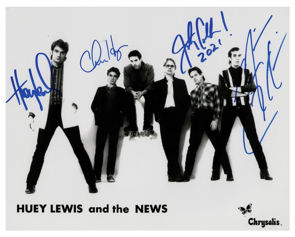 Glossy 10 x 8 Chrysalis Records publicity photo of Huey Lewis and the News, signed in blue felt tip by Huey Lewis, Mario Cipollina, Johnny Colla, and Chris Hayes. In fine condition.