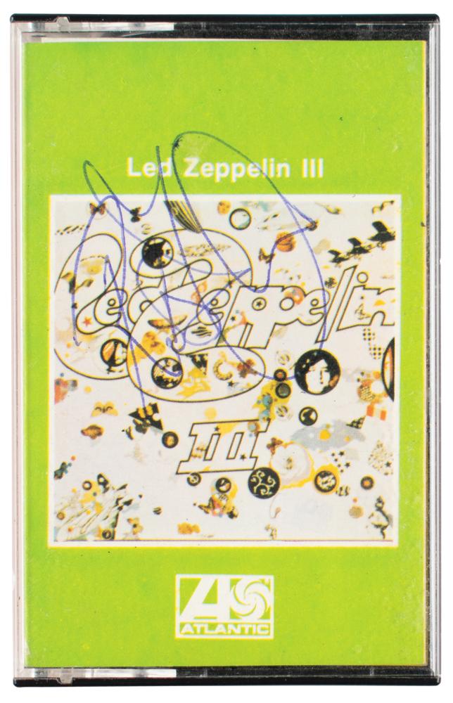 Atlantic Records cassette tape of Led Zeppelin III by Led Zeppelin, signed on the front of the J-card in ballpoint by Robert Plant. The title edge is annotated with the date of January 1, 1977, ostensibly when the autograph was obtained. In fine condition. The tape is included.