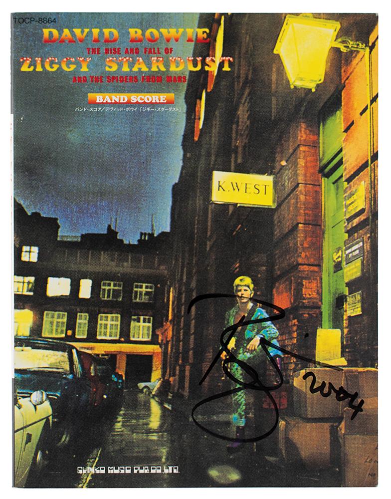Japanese band score book for the David Bowie album The Rise and Fall of Ziggy Stardust and the Spiders from Mars. Published by Shinko Music, 2000. Softcover, 8.5 x 11, 136 pages. Signed on the front cover in black felt tip, "Bowie, 2004." In fine condition. Accompanied by a letter of authenticity from Bowie expert Andy Peters.