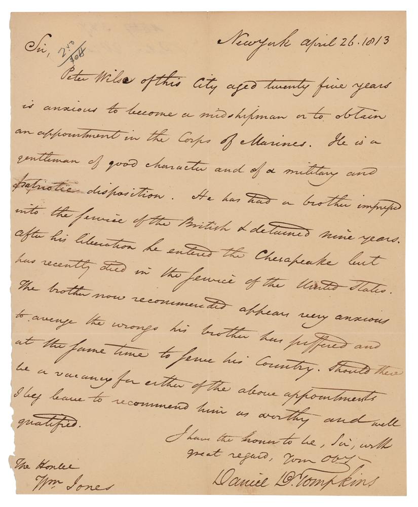 The sixth vice president of the United States under James Madison, who also served as the fourth governor of New York (1774-1825). ALS signed “Daniel D. Tompkins,” one page, 7.75 x 9.5, April 26, 1813. Handwritten letter to the Secretary of the Navy William Jones, in part: "Peter Wise of this City aged twenty five years is anxious to become a midshipman or to obtain an appointment in the Corps of Marines He is a gentleman of good character and of a military and patriotic disposition. He has had a brother impressed into the service of the British & detained nine years. After his liberation he entered the Chesapeake but has recently died in the service of the United States. The brother now recommended appears very anxious to avenge the wrongs his brother has suffered and at the same time to serve his Country. Should there be a vacancy for either of the above appointments I beg leave to recommend him as worthy and well qualified." In fine condition.