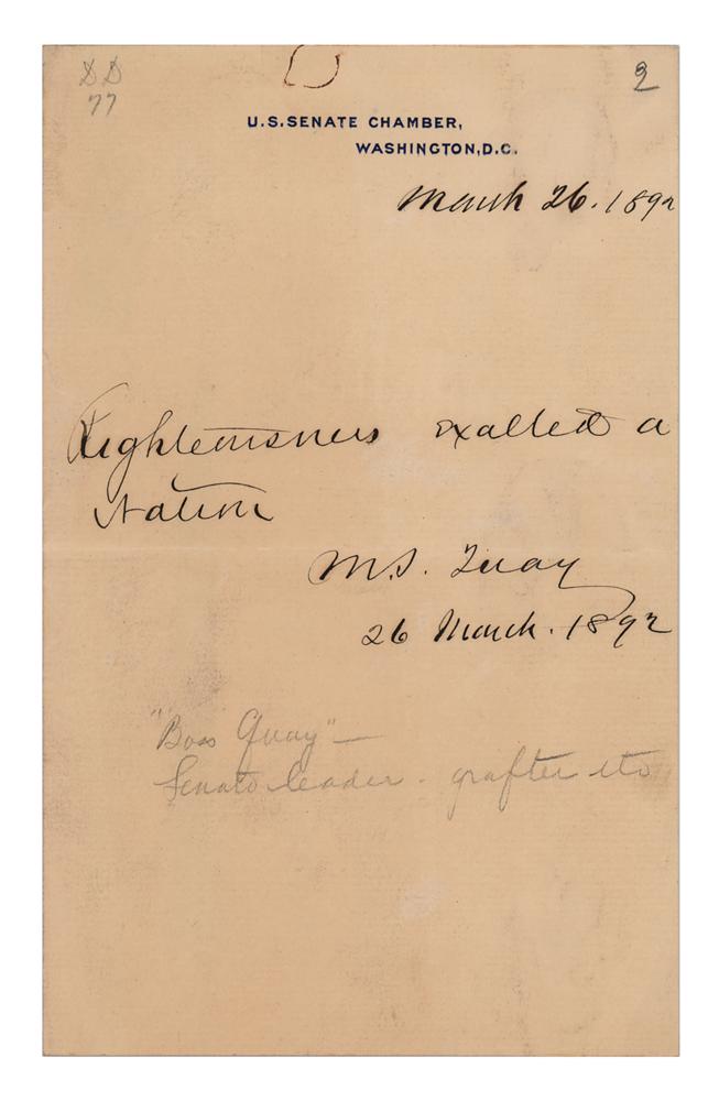Pennsylvania political boss (1833-1904) once dubbed a 'kingmaker' by President Benjamin Harrison; before his political career, he served in the Union Army and received the Medal of Honor for heroism at the Battle of Fredericksburg. AQS signed "M. S. Quay, 26 March 1892," on an off-white 5 x 8 sheet of U. S. Senate Chamber letterhead. Quay quotes from Proverbs 14:34, in full: "Righteousness exalted a nation." In very good to fine condition, with some minor staining from adhesive to reverse, a few pencil notations, and a rusty circular paperclip impression to the top.