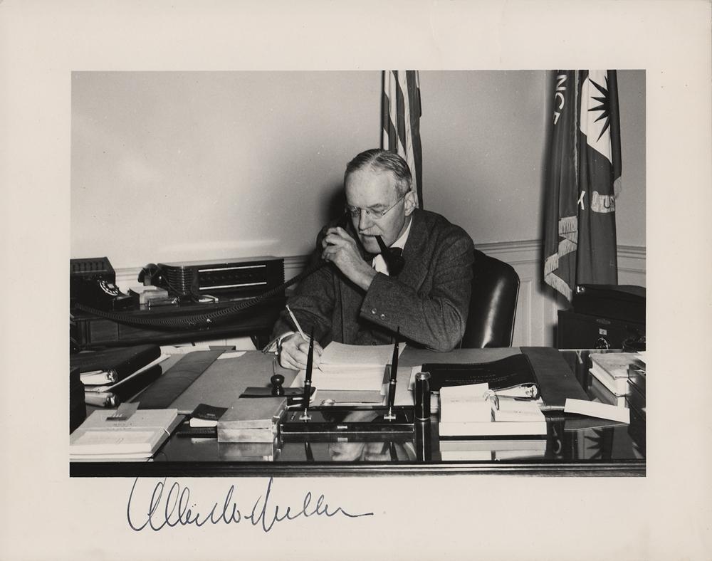 American diplomat and lawyer (1893-1969) who became the first civilian director of the CIA. Vintage matte-finish 10 x 8 photo of Allen Dulles talking on the phone and smoking a pipe at his desk, signed in the lower border in black ink. In very good to fine condition, with scattered creasing.