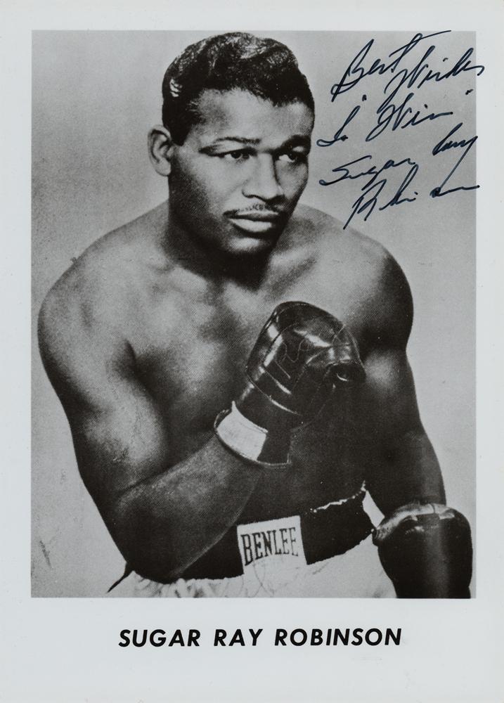 Glossy 5 x 7 promotional photo of the legendary boxer, signed and inscribed in black felt tip, "Best wishes to 'Win,' Sugar Ray Robinson.” In fine condition.
