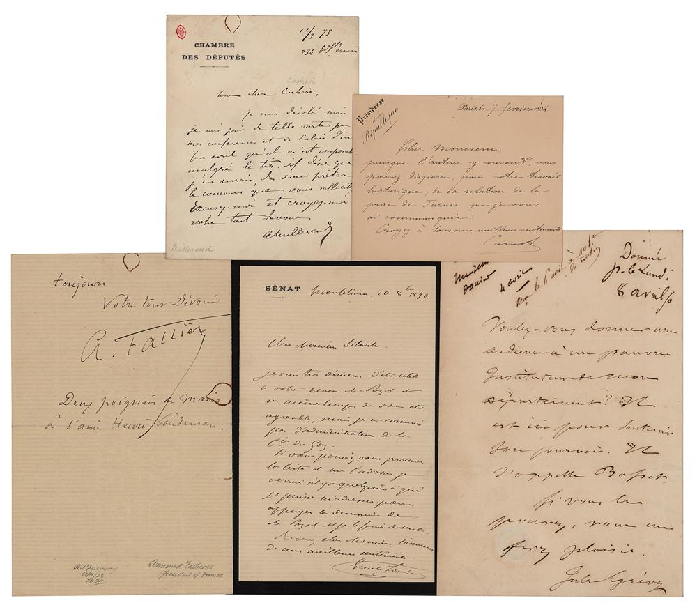 Five letters signed by French presidents from the late 19th and early 20th centuries, including: Jules Grévy (ALS), Marie François Sadi Carnot (LS), Émile Loubet (ALS), Armand Fallières (ALS), and Alexandre Millerand (ALS). In very good to fine condition, with rusty circular paperclip impressions to most letters.