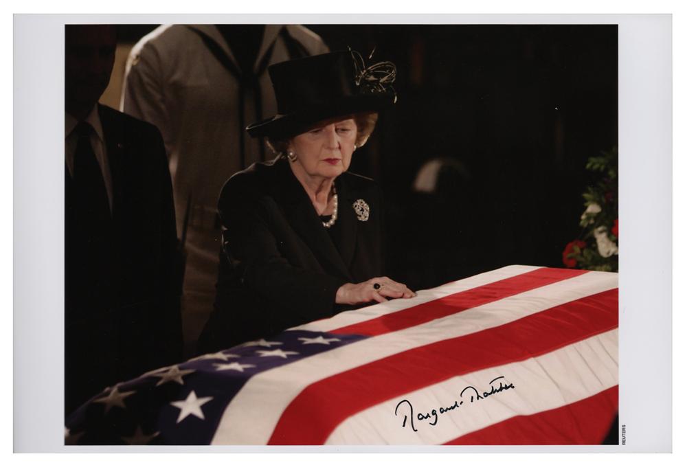 Color glossy 12 x 8 photo of Margaret Thatcher touching the flag-draped coffin of Ronald Reagan, signed in black felt tip. In very good to fine condition, with vertical bends to the right background area.