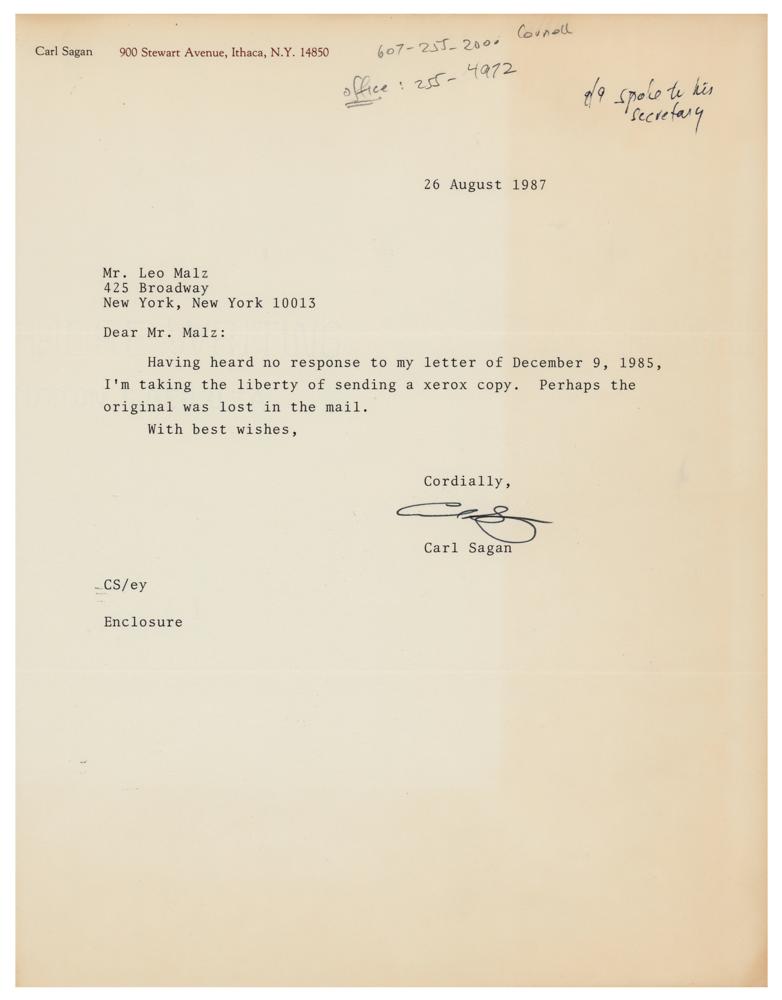 TLS, one page, 8.5 x 11, personal letterhead, August 26, 1987. Letter to Leo Malz, in full: "Having heard no response to my letter of December 9, 1985, I'm taking the liberty of sending a xerox copy. Perhaps the original was lost in the mail." In fine condition.