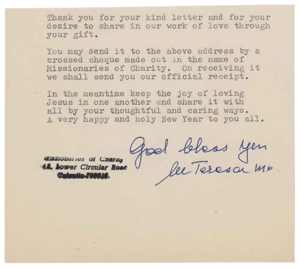 Partial TLS signed “God bless you, M Teresa mc,” one page, 5.75 x 5, no date. In full: "Thank you for your kind letter for your desire to share in our work of love through your gift. You may send it to the above address by a crossed cheque made out in the name of Missionaries of Charity. On receiving it we shall send you our official receipt. In the meantime keep the joy of loving Jesus in one another and share it with all by your thoughtful and caring ways. A very happy and holy New Year to you all." In fine condition, with the top of the letter trimmed off.