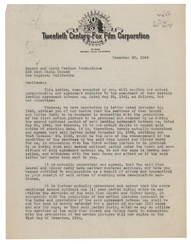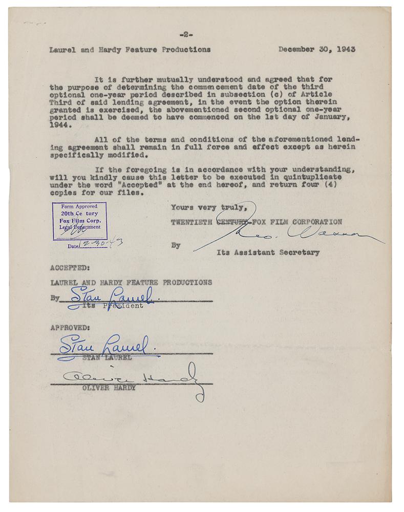DS, two pages, 8.5 x 11, December 30, 1943. Confirmation of an agreement with Twentieth Century-Fox Film Corporation regarding the cancelation of a lending agreement. In part: "It is mutually understood and agreed, that the said Stan Laurel and Oliver Hardy have neither rendered services, nor have you become entitled to compensation." Signed twice at the conclusion by Stan Laurel, and once by Oliver Hardy. In fine condition, with light corner creasing, and faint rusty paperclip impressions.