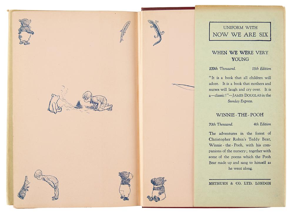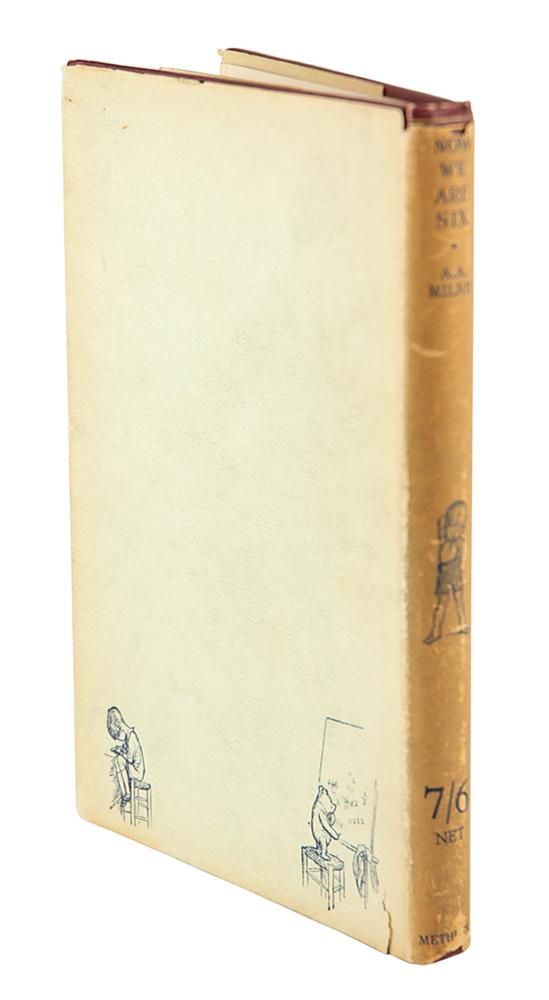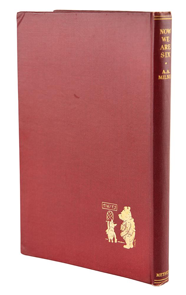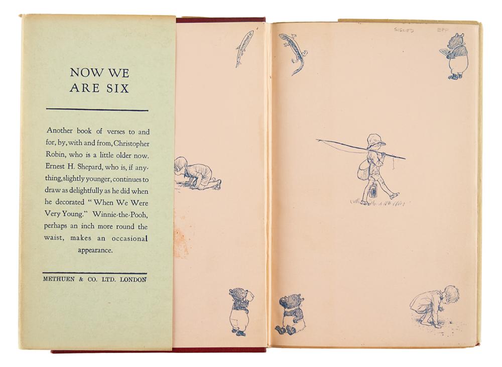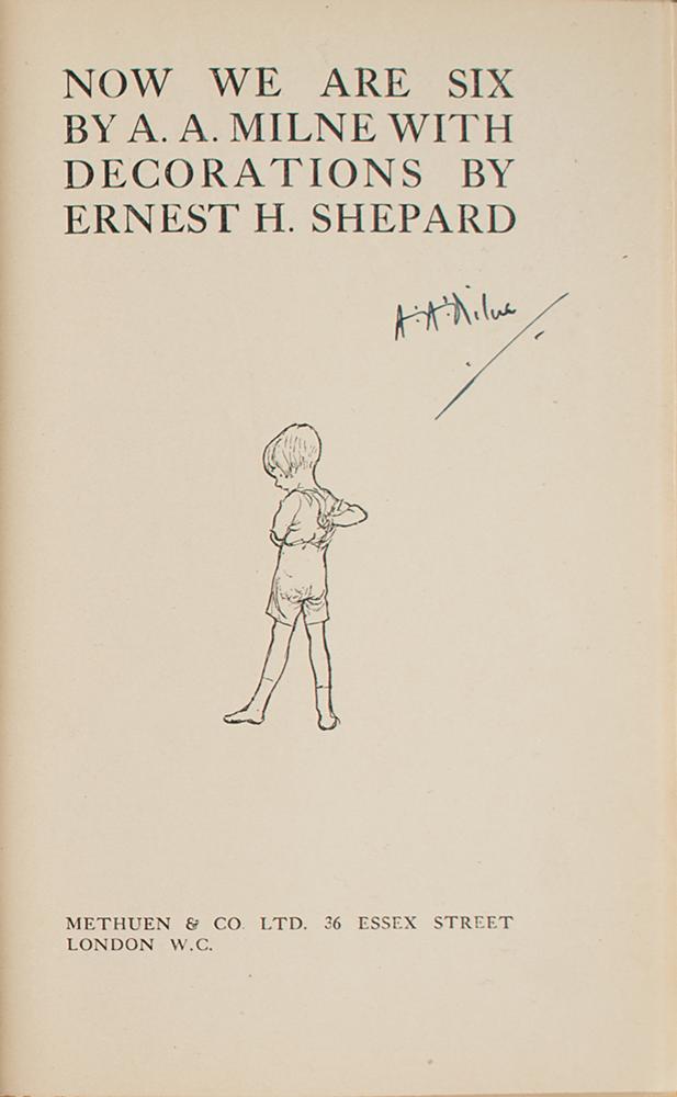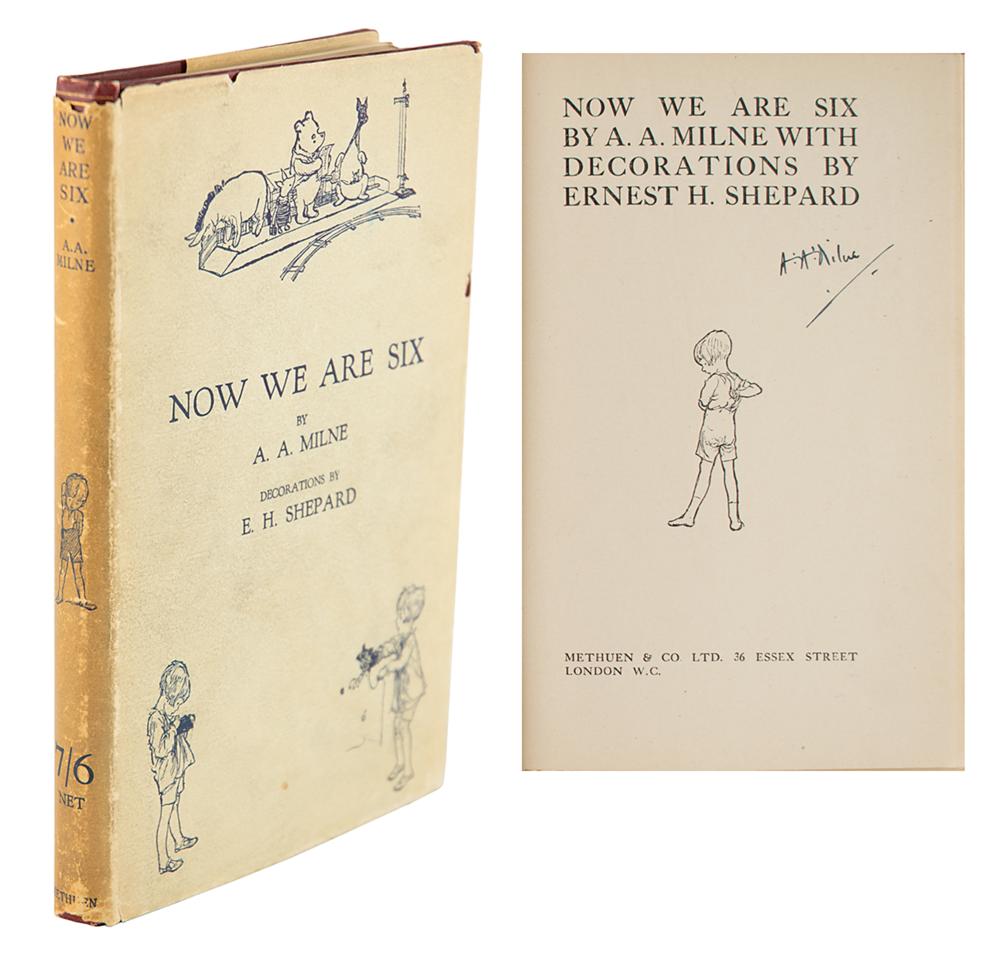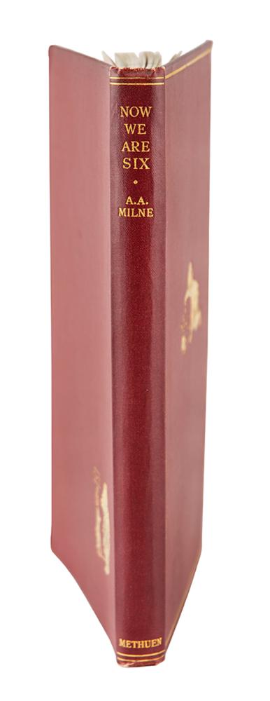 Rare signed book: Now We Are Six. First edition, first printing. London: Methuen & Co., 1927. Hardcover bound in original red cloth with gilt borders and illustrations on covers, 5 x 7.5, 103 pages. Signed on the title page in fountain pen by the author, "A. A. Milne." Autographic condition: fine. Book condition: VG+/VG, with bands of toning to endpapers, slightly bumped corners, trivial wear to spine ends, and minor adhesive remnants to front pastedown (likely a removed bookplate); dust jacket has several edge chips, a minor loss at front flap hinge, toned edges, spine darkened, and light soiling.