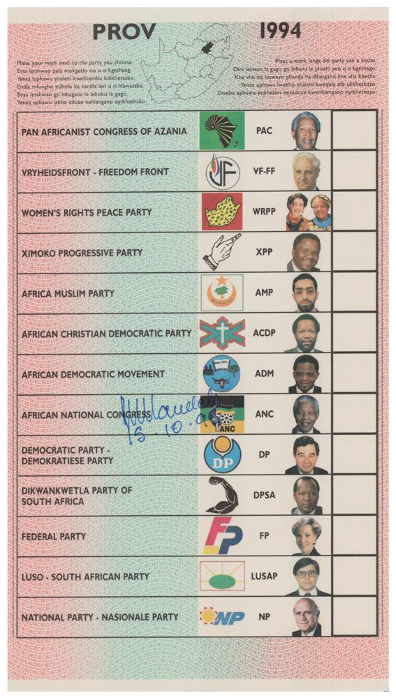 Uncommon color 6.75 x 12 ballot for the 1994 Republic of South Africa general elections, signed near his image in blue felt tip, "N. Mandela, 15.10.99." In very fine condition. Mandela became the country's first black chief executive when his African National Congress won a sweeping victory in the South African general election of 1994.