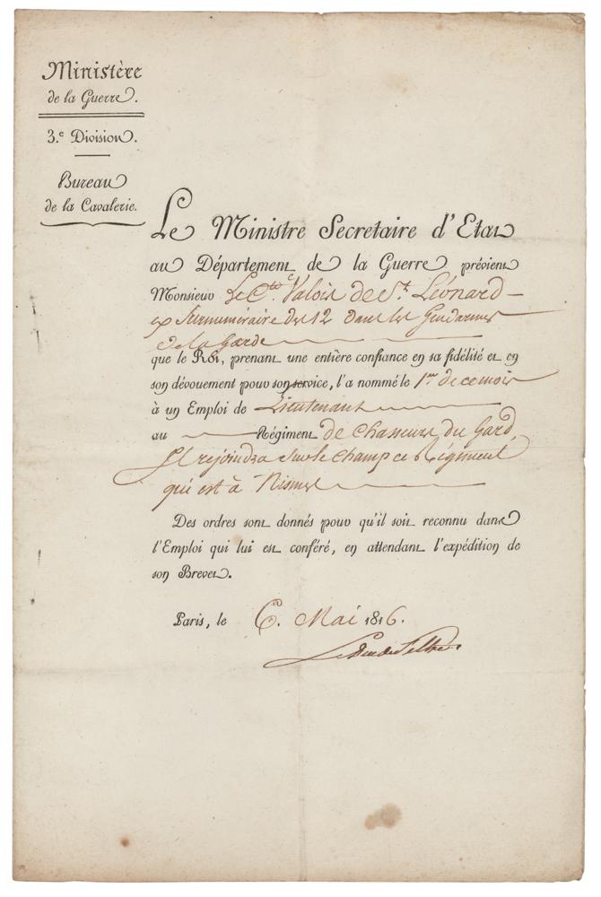 French army officer of Irish descent (1765-1818) whose role in thwarting the British invasion of Walcheren in 1809 led to the emperor creating him Duc de Feltre; he was made a Marshal of France in 1816, and served as Minister of War until the end of Napoleon's reign. Partly-printed DS, in French, signed “Le Duc de Feltre,” one page, 8 x 12, May 6, 1816. Official untranslated military commission for a lieutenant in the "Regiment de Chasseurs du Gard" issued by Clarke as Minister of War. In fine condition, with intersecting folds, light creasing, and a few small stains.