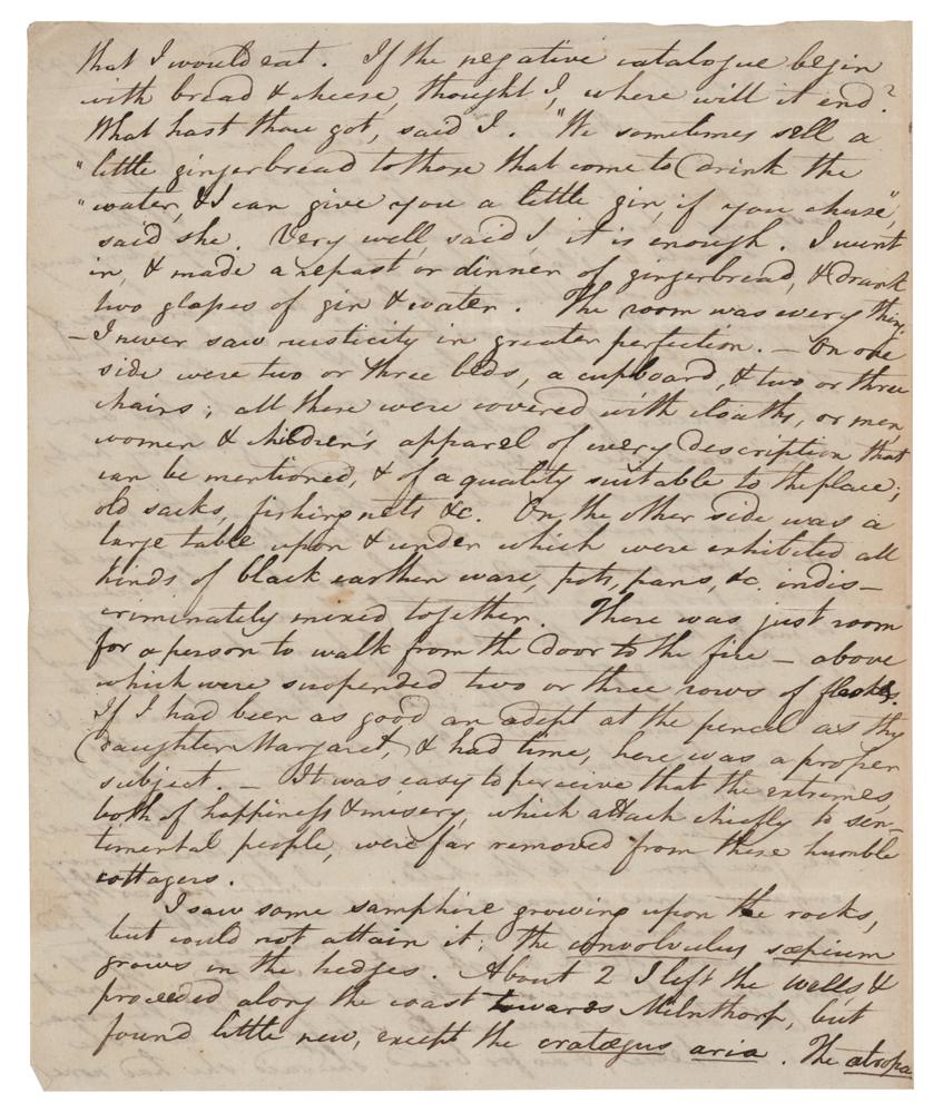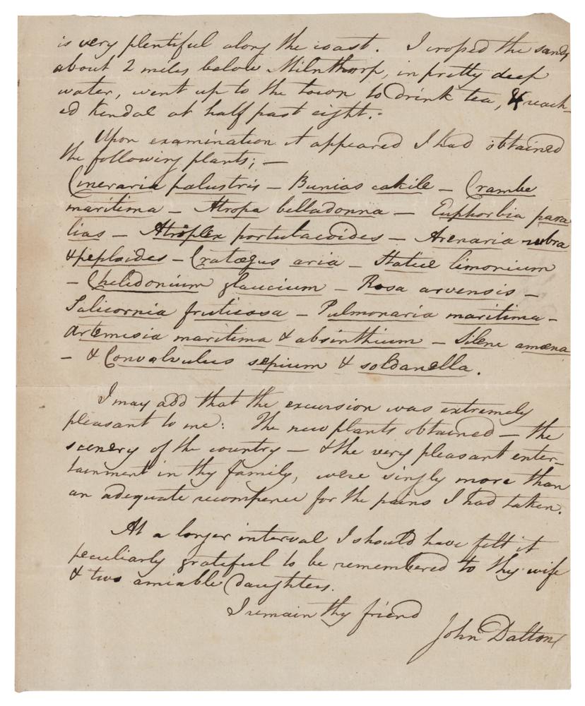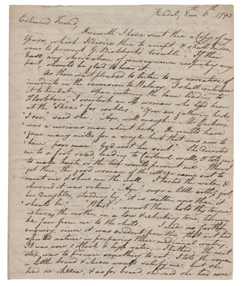 English chemist, meteorologist, and physicist (1766-1844) best known for his pioneering work in the development of modern atomic theory. ALS, three pages on two adjoining sheets, 7.25 x 9, October 6, 1795. Handwritten letter to an "Esteemed Friend," in part: "Herewith I have sent thee a Copy of my Essays, which I desire thee to accept & shall endeavour to prevent G. Birkbeck's trouble?As thou shall want pleased to listen to my narrative of incidents in the excursion to Walney, I shall continue it to Kendal?I overtook an old woman who had been at the 'Skear' for cockles. 'You are gathering herbs, I see,' said she. 'Aye, well enough—Mr. Jackson was a curious man about herbs. He would have gone many miles for a single herb that was new to him, poor man. God rest his soul.' She directed me to a foot road?and told me to make haste or the tide would prevent me. When I got there, the good woman of the cottage came out to meet me & show me the well. I tasted the water, & observed it was saline. 'Aye,' says a little artless girl, her daughter, standing by, 'it is saltier now than it should be.' 'Whist! cannot thou hold thy tongue,' returns the mother in a low & rebuking tone, turning her face from me to the child. I made no farther enquiry, since it was evident from this, that art had assisted nature in preparing these medicinal waters. It was now 1 o'clock & high water;—I bathed. The next step was to procure something to eat. I told the woman a little bread & cheese would satisfy me, but she had no cheese, & as for bread, she said she had none that I would eat. If the negative catalogue begin with bread & cheese, thought I, where will it end? What hast thou got, said I. 'We sometimes sell a little gingerbread to those that come to drink the water, & I can give you a little gin, if you choose,' said she. Very well, said I, it is enough. I went in & made a repast or dinner of gingerbread & drunk two glasses of gin & water. The room was everything—I never saw rusticity in greater perfection. On one side were two or three beds, a cupboard, & two or three chairs; all these were covered with cloaths, or men, women & children's apparel of every description that can be mentioned, & of a quality suitable to the place; old sacks, fishing nets, &c. On the other side was a large table upon & under which were exhibited all kinds of black earthenware, pots, pans &c, indiscriminately mixed together. There was just room for a person to walk from the door to the fire—above which were suspended two or three rows of flasks?It was easy to perceive that the extremes, both of happiness & misery, which attach chiefly to sentimental people, were far removed from these humble cottages.