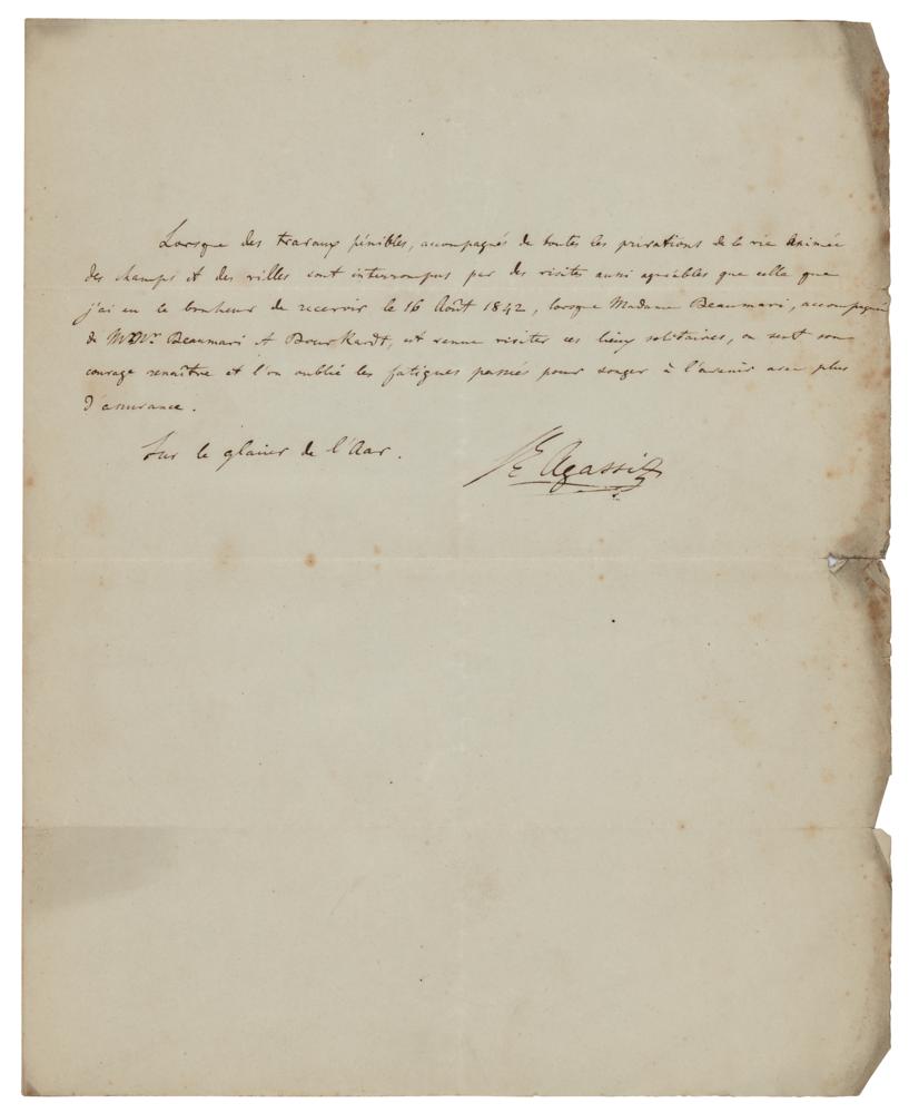 Eminent and versatile Swiss-born American zoologist and geologist (1807-1873) who carried out much of his research as a longtime faculty member at Harvard, where he was also instrumental in building the university’s enviable natural history collection. ALS in French, signed “L. Agassiz,” one page, 8.5 x 10.5, no date. Handwritten letter from the "Glacier de l'Aar" in the Bernese Alps, where he built a hut—the 'Hôtel des Neuchâtelois'—to conduct his scientific observations of the glacier. He acknowledges with gratitude some of the very nice visitors he received there. In very good to fine condition, with scattered light foxing, and wear and staining to the right edge. In 1847, Agassiz published his Système glaciaire, in which he thoroughly discussed the chief phenomena of glaciers.