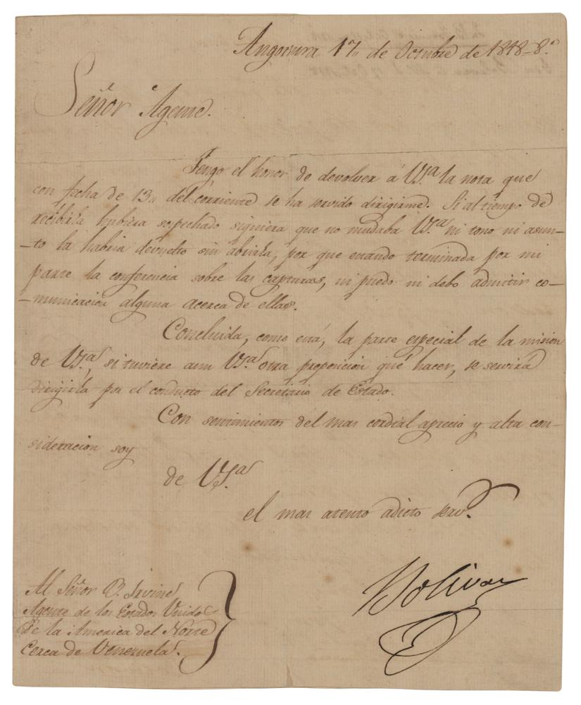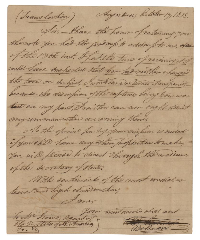 LS in Spanish, signed “Bolivar,” one page, 7.25 x 9, October 17, 1888. Letter to Baptis Irvine, agent of the United States in Venezuela, in part (translated): "I have the honor of returning you the note you had the goodness to address to me, of the 19th inst. If at the time of receiving it I could have inspected that you had neither changed to tone or subject, I would have returned it unopened, because the discussion of the captures being terminated on my part, I neither can nor ought admit any communication concerning them." He advises that further communications on the matter be directed through the secretary of state. A manuscript translation to English has been penned on the reverse. In fine condition, with scattered light foxing, and overall silking.