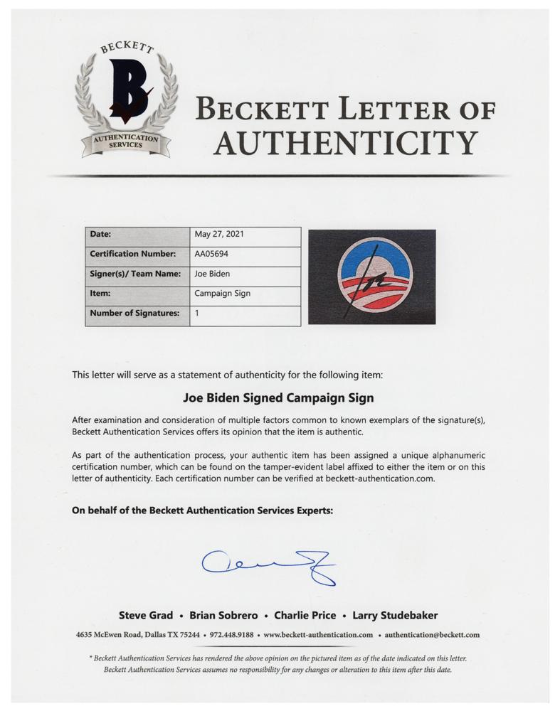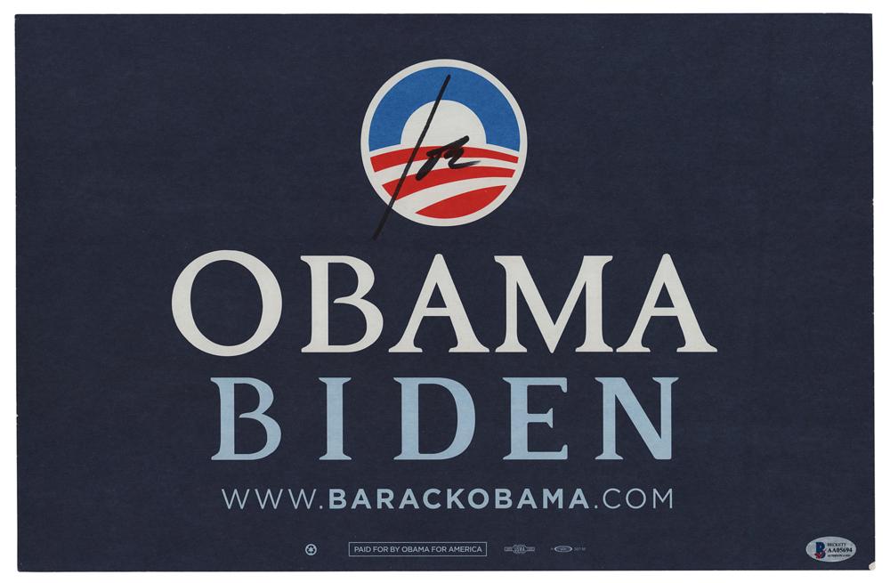2008 presidential campaign sign for the Democratic ticket of Barack Obama and Joe Biden, 17 x 11, signed in black felt tip, "Joe." In fine condition, with a Beckett authenticity label affixed to the lower right corner. Accompanied by a full letter of authenticity from Beckett Authentication Services.
