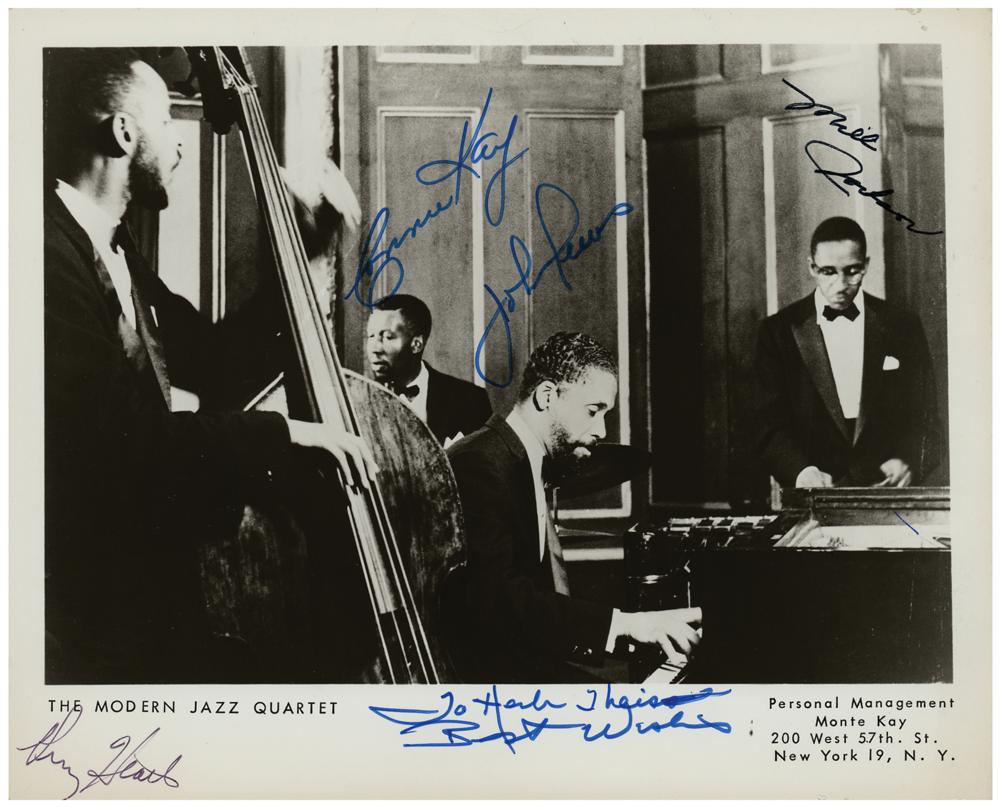 Glossy 10 x 8 publicity photo of the Modern Jazz Quartet playing their instruments, signed in black felt tip by Percy Heath and Milt Jackson, and in blue felt tip by Connie Kay and John Lewis, with one of the latter two adding the inscription: "To Herb Theis, Best wishes.” In fine condition.
