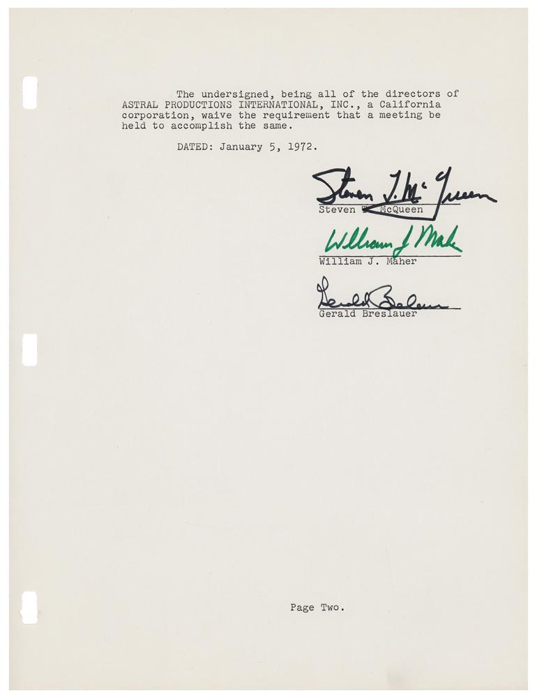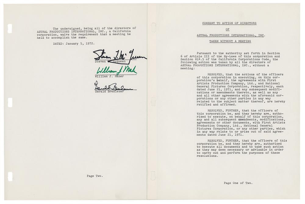 DS, signed “Steven T. McQueen,” two pages, 8.5 x 11, January 5, 1972. Document headed "Consent to action of board of directors of Astral Productions International, Inc., taken without a meeting," relating to the ratification and the authorization of agreements and documents with First Artists Production Company and National General Pictures Corporation. Signed at the conclusion by in black felt tip Steve McQueen, and countersigned by William J. Maher and Gerald E. Breslauer. In fine condition.