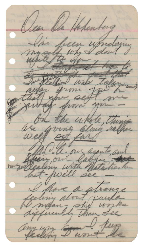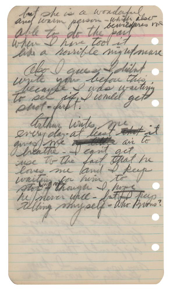 Handwritten letter in pencil by Marilyn Monroe, unsigned, one page, both sides, 3.75 x 6.75, no date (circa 1956-1957). Addressed to Dr. Margaret Hohenberg, in full (struck through words are in brackets): "I’ve been wondering myself why I don’t write to you. [I thought it has to do with the part that] I’ve been feeling I was taken away from you or that you sent me away from you [with your permission]. On the whole, things are going rather well so far. M.C.A., our agents, and Stein, our lawyer [are], have dealt dealing with Natasha but, we’ll see—I have a strange feeling about Paula. I mean, she works differently than Lee. Anyway I keep feeling I won’t be able to do the part when I have too it like a horrible nightmare. [at the top, Monroe continues on about Paula Strasberg: “but she is a wonderful and warm person—which also bewilders me”] Also I guess I didn’t write you before this because I was waiting to see if I would get shot-first. Arthur writes me every day, at least [that] it gives me [a little] air to breathe, I can't get used to the fact that he loves me and I keep waiting for him to stop loving me though I hope he never will, but I keep telling myself, who knows?" In fine condition. This letter is published in the 2010 book Fragments: Poems, Intimate Notes, Letters (pgs. 202-203).