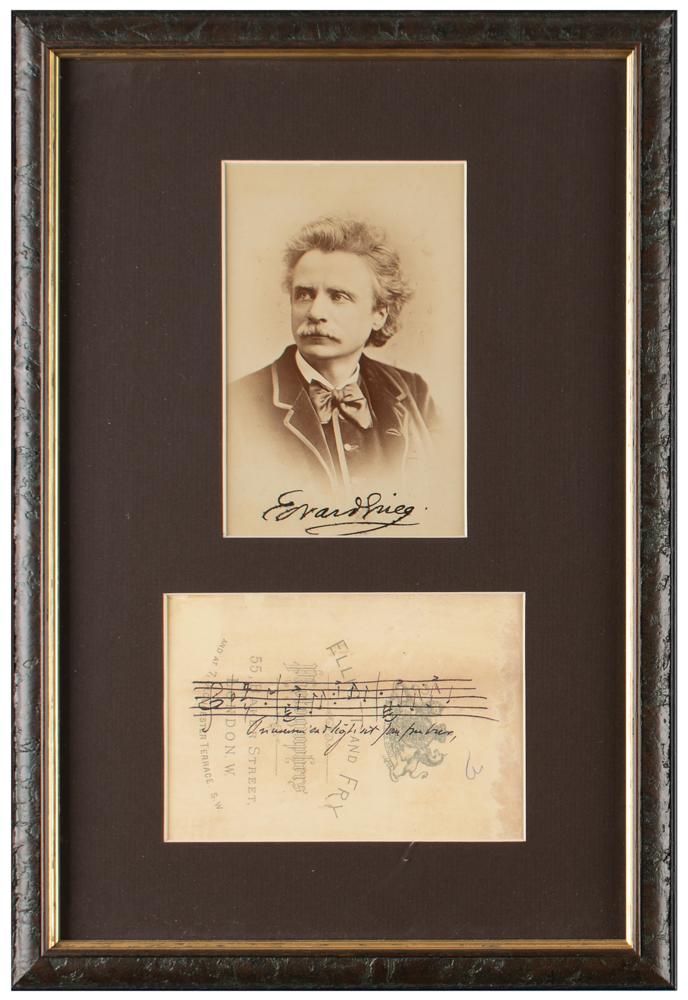 Important Norwegian composer and pianist (1843-1907) whose works, often with a strong nationalistic flavor, include such repertory staples as the 'Piano Concerto in A minor,' the incidental music to Peer Gynt, and the 'Holberg Suite.' Highly desirable 3.75 x 5.75 cabinet photo of Grieg by Elliott & Fry of London, boldly signed below the image in ink, "Edvard Grieg." On the reverse, Grieg has penned four bars of music from one of his works; matted and framed under Tru-Vue Conservation Clear with a color copy of the musical quotation to an overall size of 10.25 x 14.25. In very good to fine condition, with slight brushing to the signature on the front, and some toning and staining to the reverse.