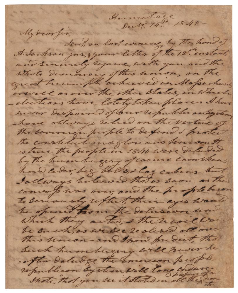 ALS, four pages on two adjoining sheets, 7.75 x 9.5, December 14, 1842. Handwritten letter to J. George Harris, editor of the Nashville Union, expressing his delight with the result of the 1842 midterm elections, criticizing the propaganda associated with the 1840 presidential campaign, and denying the claims of Democratic newspapers that he and his former vice president, John C. Calhoun, had reconciled.