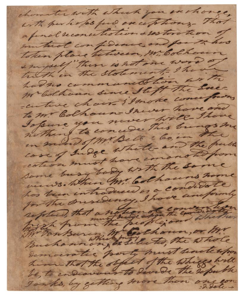 I note 'that you will see it stated in all the papers of a dem. character with which you exchange, with perhaps few exceptions, that a final reconciliation & restoration of mutual confidence and faith has taken place between Mr. Calhoun & myself.' There is not one word of truth in the statement. I have had no communication with Mr. Calhoun since I left the Executive chair-& I make [no] concessions to Mr. Calhoun-I never have and I assure you never will-I have nothing to concede. This brings me in mind of Mr. [John] Bell & Co., in the case of Judge [Hugh Lawson] White and the publication must have emanated from some busybody with the same views. When Mr. Calhoun's name has been introduced as a candidate for the presidency, I have uniformly replied that a national convention fresh from the people must decide upon the candidate; and whether that be Mr. Van Buren, Mr. Calhoun, or Mr. Buchannan which may be selected, the whole Democratic Party must unite upon him-that the object of the Whiggs will be to endeavour to divide the republi[can] ranks, by getting more than one candidate into the field, like Bell with Judge White, to divide and conquer?Should Mr. Calhoun be selected by the Democratic Peoples Convention to be holden, I as one of the Democrats would?support [the] candidate thus represented."
