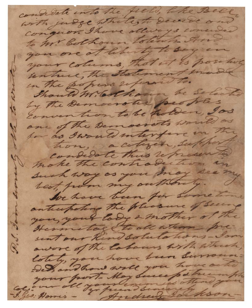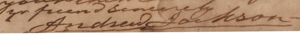 In the postscript, he refers to a letter he had written to the editor of the Cincinnati Advertiser, Moses Dawson, one year earlier on December 16, 1841, outlining his views concerning the constitutional limits of Congress to produce currency: 'The sages who made our constitution, intended to guard us forever against a paper mon[e]y currency?[N]either the general government nor the states, have any constitutional power, to make a paper currency, neither thro corporations or by bills of credit.' A significant handwritten letter from Jackson with outstanding political content.
