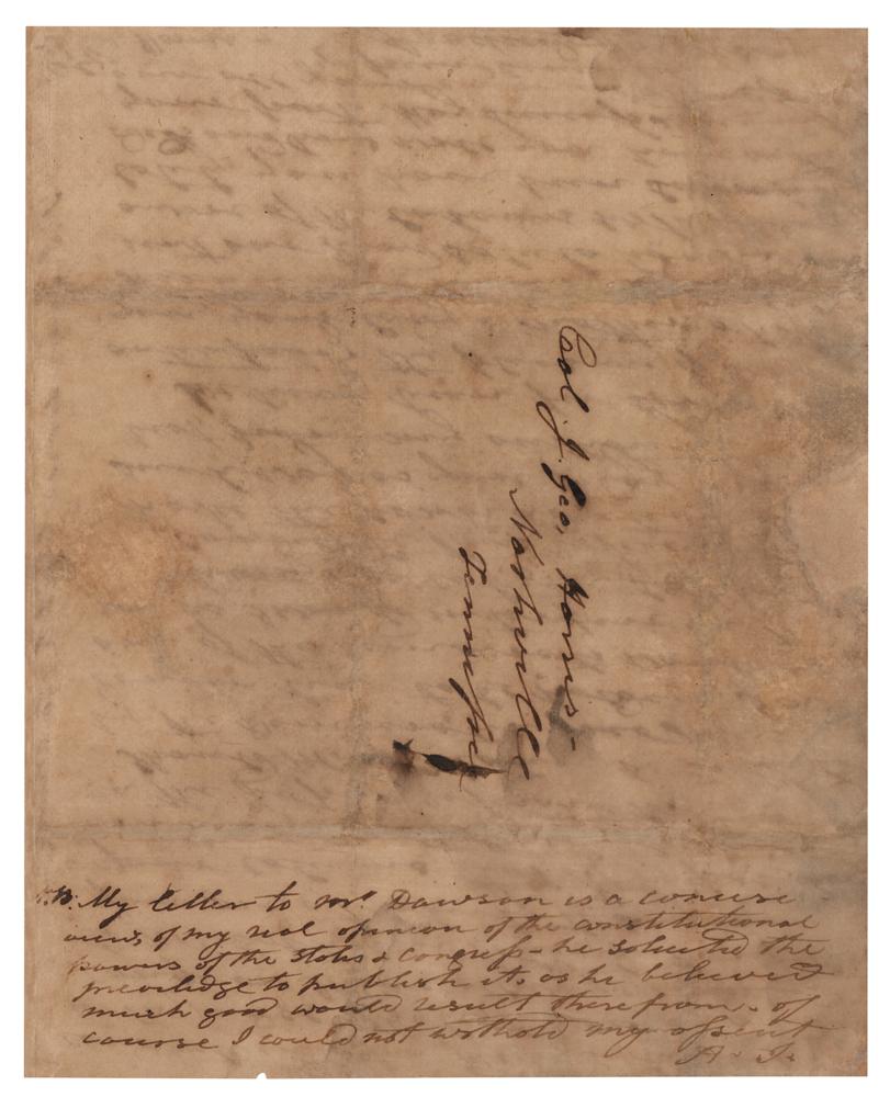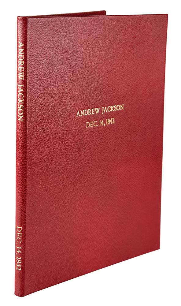He adds a handwritten postscript on the address leaf, signed with his initials, "A. J.," in part: "My letter to Mr. Dawson is a concise view, of my real opinion of the constitutional powers of the states & Congress-he solicited the privilege to publish it, as he believed much good would result there from. Of course I could not withhold my assent." Professionally repaired and restored to near fine condition, with a small tear to the edge of the last page. Accompanied by a handsome custom-made finely bound full morocco leather case.