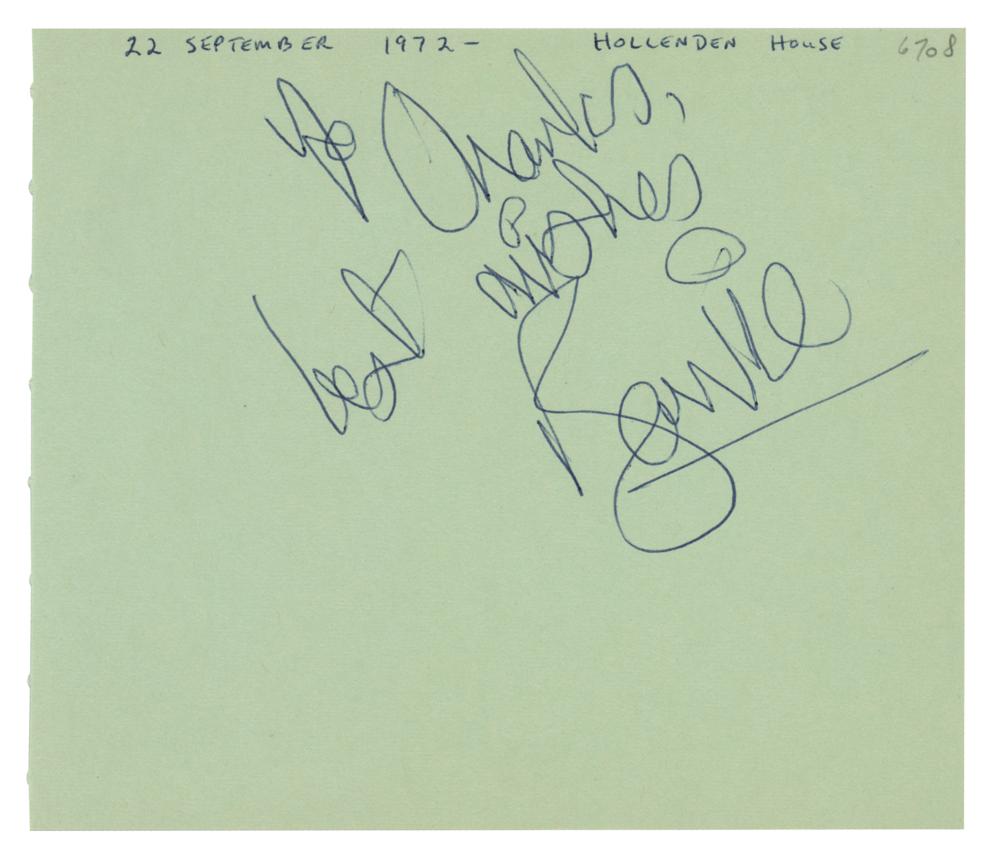 Vintage ballpoint signature and inscription, "To Charles, best wishes, Bowie,” on a light green 5.25 x 4.5 album page, annotated along the top by the collector: "22 September 1972 - Hollenden House." In very fine condition. On this date, September 22, 1972, Bowie played the first American show of his iconic Ziggy Stardust Tour at the Cleveland Music Hall.