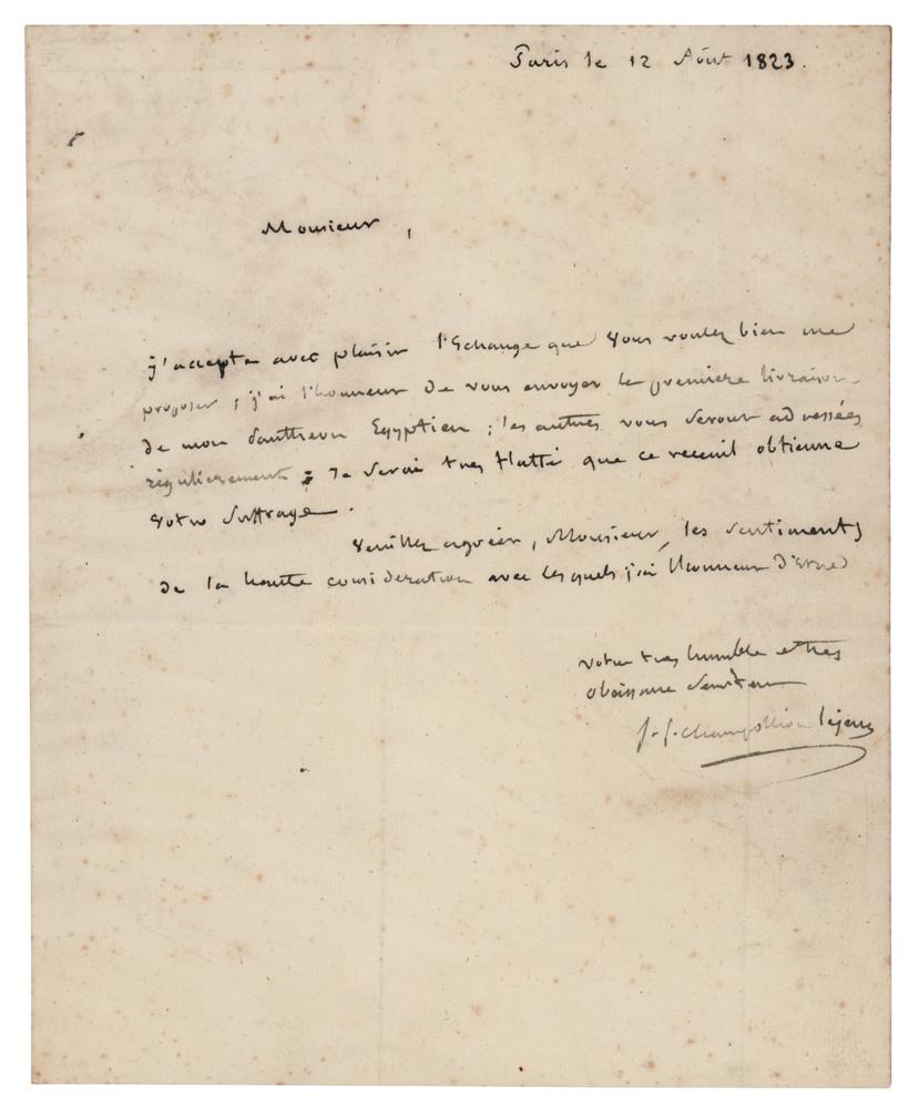 French scholar (1790-1832) who published the first translation of the Rosetta Stone hieroglyphs in 1822. Rare ALS in French, signed "J. F. Champollion, Le jeune," one page, 7 x 8.5, April 12, 1823. Letter to the famous German linguist Julius Heinrich Klaproth (1783-1835) in Paris. Translated in full: "Sir I accept with pleasure the exchange you were kind to propose and I send you the first published part of my 'Egyptian Pantheon.' The others will be sent to you as they will appear in print. I will be very flattered if they meet with your approval. Please accept the expression of the high consideration in which you are kept by your humble servant." Reverse of second integral page bears an address panel in another hand, as well as docketing. In fine condition, with scattered light foxing. Neither the first nor the following parts of Champollion's masterwork met with Klaproth's approval, who criticized the French scholar's work in his own book published four years later: 'Letter on the Discovery of Hieroglyphs.' A very important exchange between the claimant of a major discovery and his main disbeliever.