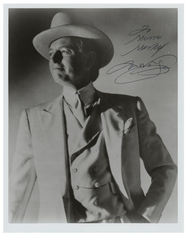 Glossy 8 x 10 photo of Tom Wolfe in his trademark white suit, signed and inscribed in black ballpoint. In fine condition, with a light horizontal bend.