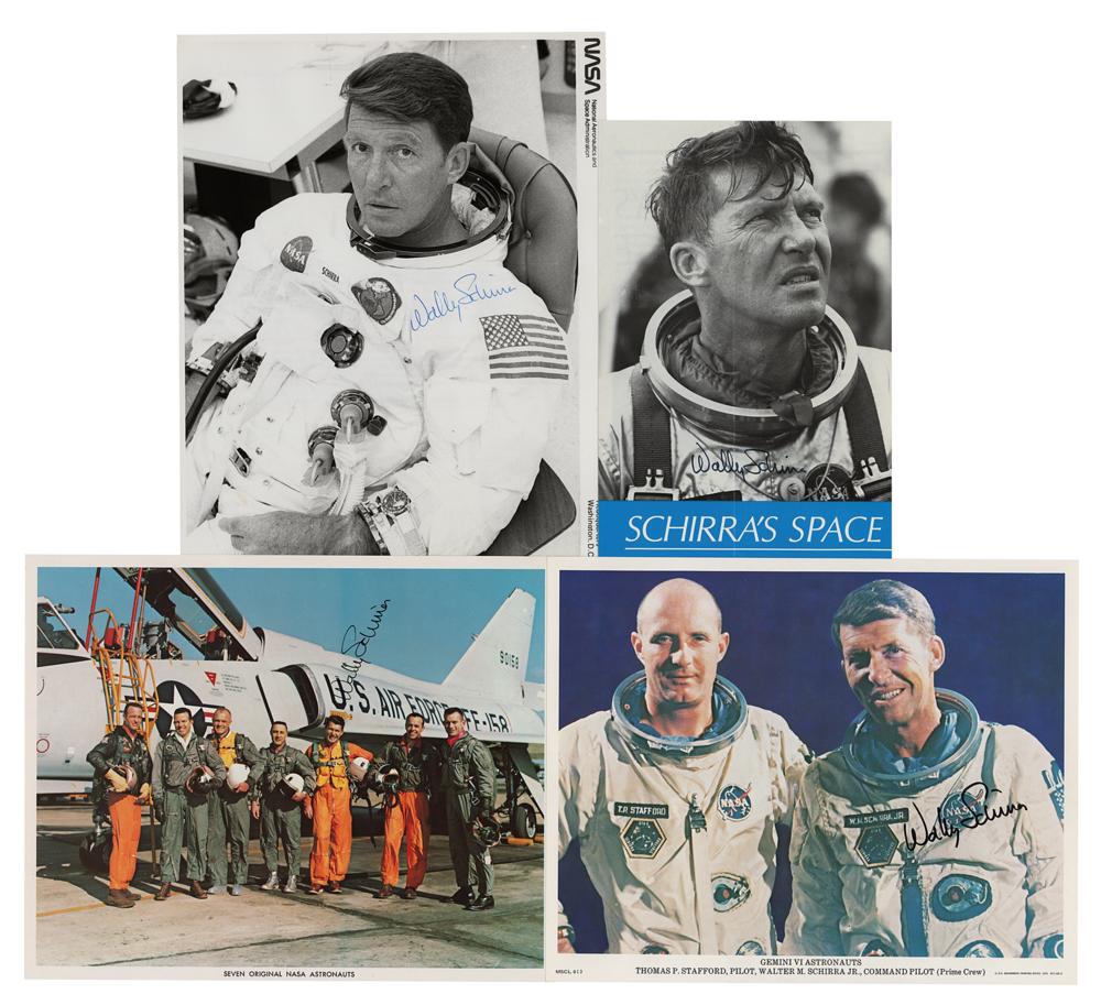 Four items signed by Wally Schirra, including: an official color 10 x 8 NASA lithograph of the Mercury 7, signed in black felt tip; an official color 10 x 8 NASA lithograph of the Gemini 6 astronauts, signed in black felt tip; an official glossy 8 x 10 photo of Schirra in his Apollo 7 spacesuit during training, signed in blue ballpoint; and a 'Schirra's Space' pamphlet, signed in black felt tip. In overall very good to fine condition, with rippling to the glossy photo and a vertical fold to the pamphlet.
