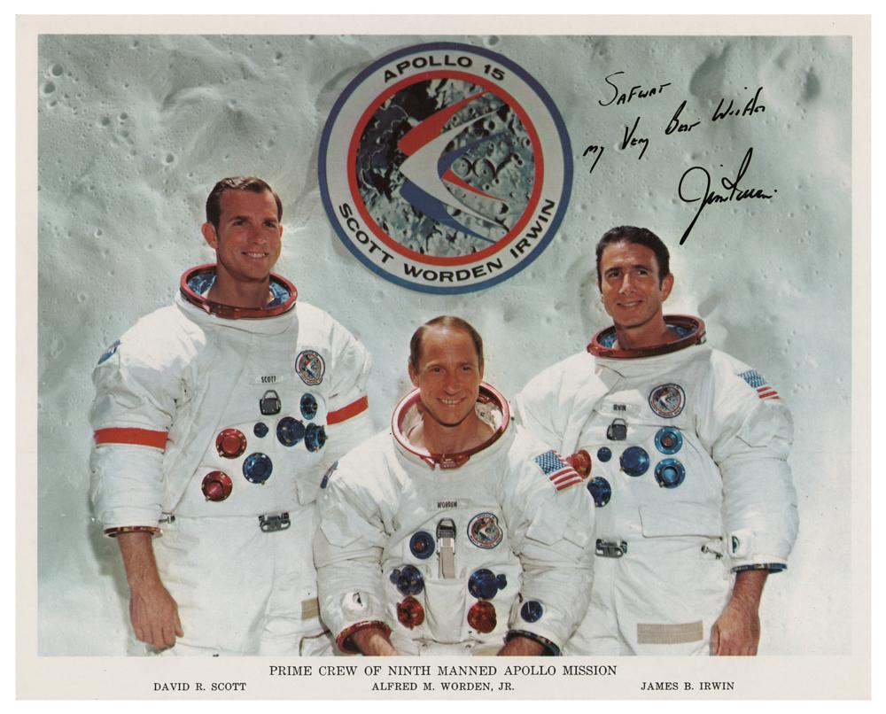 Official color 10 x 8 NASA lithograph of the Apollo 15 crew in their white space suits, signed and inscribed in black felt tip, "Safwat, My Very Best Wishes, Jim Irwin.” In fine condition.