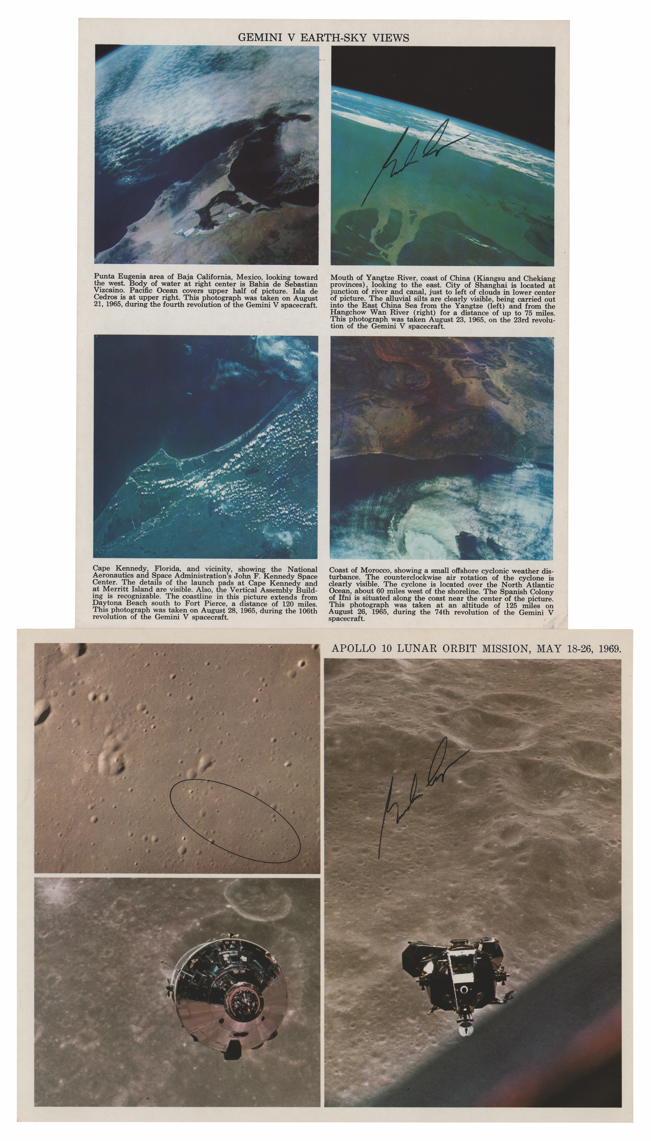 Two official color NASA lithographs: an 8 x 10 lithograph of Gemini V Earth-Sky views, signed in black felt tip by Gordon Cooper; and a 10 x 8 lithograph of lunar surface views from Apollo 10, signed in black felt tip by Gordon Cooper. In overall fine condition, with subtle diagonal bends to two corners.