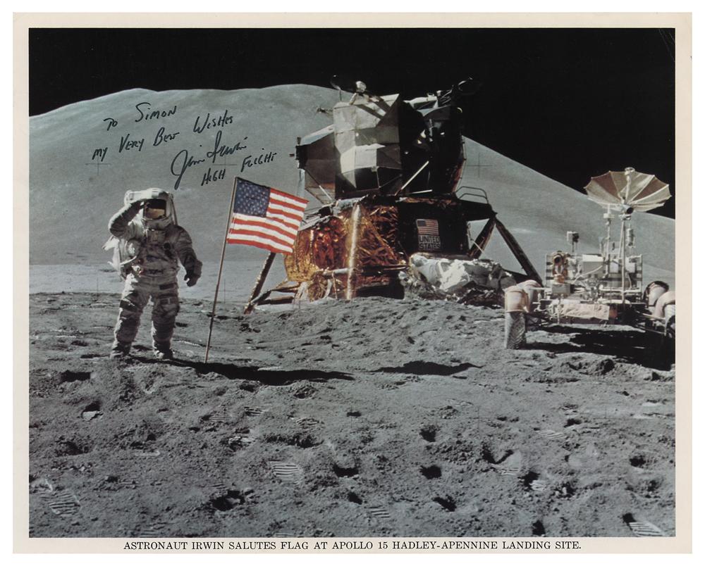Official color 10 x 8 NASA lithograph of LMP Irwin saluting the American flag on the lunar surface, signed and inscribed in black felt tip, "To Simon, My Very Best Wishes, Jim Irwin, High Flight.” In fine condition, with creasing to the upper right corner.