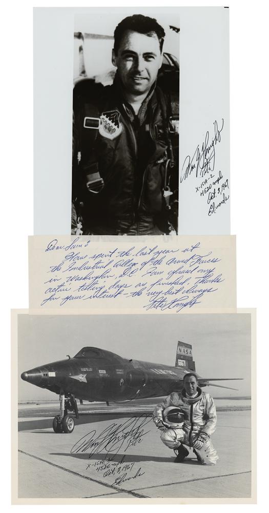 Three items: a glossy 8 x 10 photo of Knight in a flight jacket, signed in black felt tip, "Wm. J. Knight, Pete, X-15A-2, 4520 mph, Oct. 3, 1967, Edwards"; a 10 x 8 lithograph of Knight posing in front of the X-15 rocket plane, signed in black ink in the same manner; and an ANS on an off-white 8.5 x 3 slip, signed "Pete Knight," in part: "I have spent the last year at the Industrial College of the Armed Forces in Washington, D.C. I am afraid my active testing days are finished." In overall fine condition.