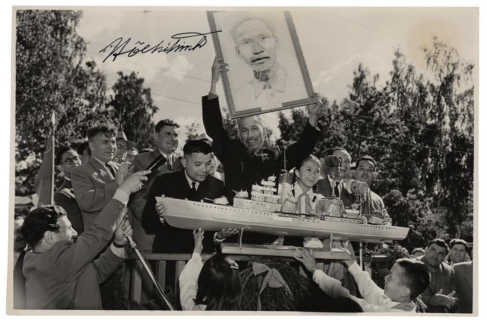 Elusive vintage glossy 9.25 x 6 photo of Ho Chi Minh during a crowded press conference in Germany in July 1957, depicting him holding up a portrait of himself over a large model of a ship, signed in black ink. In fine condition, with a light stain to the upper right corner from old mounting residue on the back.