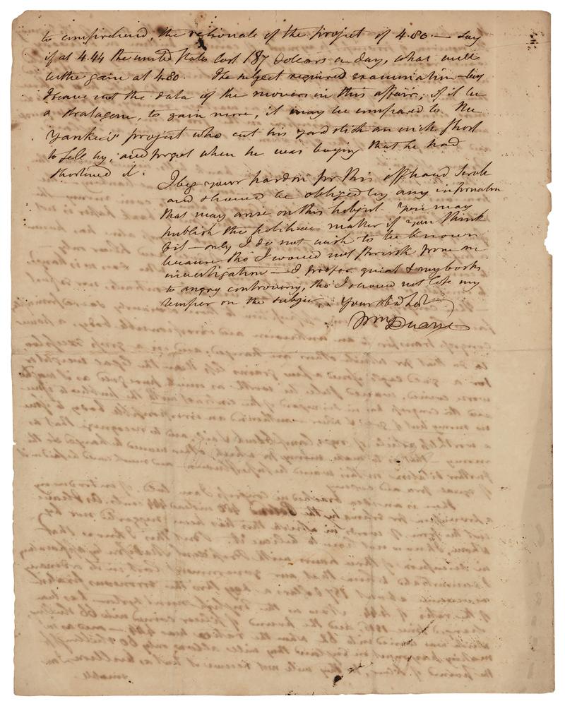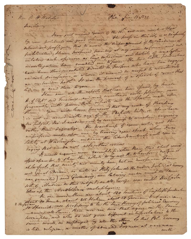 American politician and lawyer (1780-1865) who served briefly as United States Secretary of the Treasury in 1833; his refusal to withdraw federal deposits from the Second Bank of the United States led to his dismissal by President Andrew Jackson. ALS signed “Wm. J. Duane,” four pages on two adjoining sheets, 8 x 10, March 18, 1832. Lengthy handwritten letter, in part: "I have seen all the reports that have been issued, by Senate, H. of Rep's and Treasury, and read sometimes with pleasure, more frequently with pain, those reports and speeches made upon them. You will have perceived that my mode of thinking is not in accord with any of the Reports, bills, or speeches on the subject: tho' I endeavoured by conciseness to awaken enquiry rather than dogmatize?In Europe—in France and Great Britain, as well as Italy (where all the modern political economy was generated) and Germany, are laboring under much the same sort of illusion on this subject, as all Europe was until DesCartes blew up the Aristotelian metaphysics. In one word—there are about 140 treatises of English production, about 60 French, about 215 Italian, about 50 German, 6 American, 2 Russian, 10 Spanish, all professing to be the true theory of political Economy—among all these, there are no two that agree?and who do note give different interpretations to the same words, as employed by all the others. So that Pol. Economy is like religion, a matter of educated dogmas at war with the professed simplicity of truth and reason?Our information we derive from incongenial sources—from Adam Smith who struck out of the French Economists and the Italian Economists a few sparks, from which he lighted up a pile producing only smoke and no light.