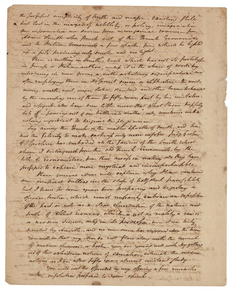 There is nothing in Smith's book which has not its prototype in French or Italian authors, unless it is the abuse of words by introducing new forms?the words money, wealth, wages, labour, standard, and others become technical by the?use of them for fifty years past by his imitators and copyists, who have done little more than what Sterne happily lists off—'pouring out of one bottle into another,' only sometimes with a coloring ingredient to disguise the plagiarism?Judge Cooper of S. Carolina has embodied all the fancies of the Smith school whom I distinguish from the old French Economists, by the title of Economistics, from their?making all they have profited to explain more mystical and incomprehensible?